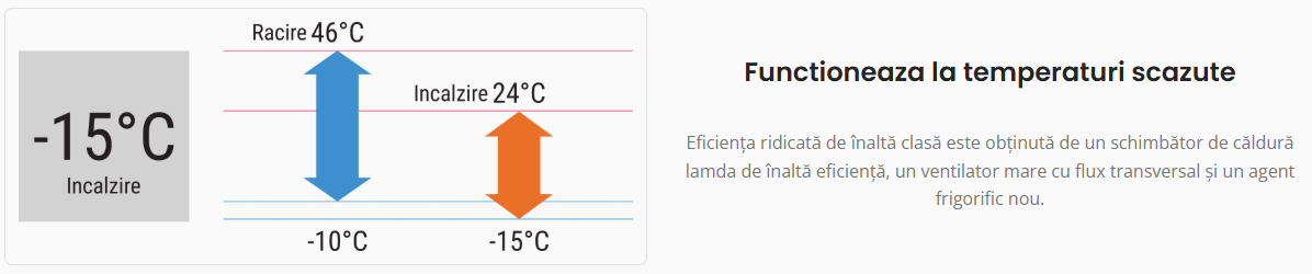 Desi de mici dimensiuni, lungimea aparatului fiind de doar 79 de centimetri, fluxul de aer de care dispune acesta este unul puternic, obtinut cu ajutorul unui schimbator de caldura, precum si prin utilizarea unui ventilator cu debit mare de aer si dimensiuni compacte. Puterea fluxului de aer se poate ajusta.