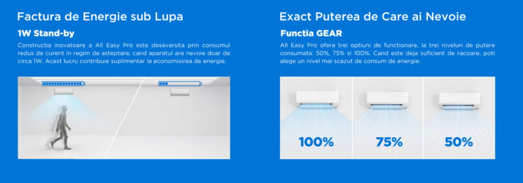 Poti racori rapid fiecare colt al camerei. Pozitionarea frontala a cutiei electrice si design-ul placii electronice elibereaza mai mult spatiu pentru grila de evacuare a aerului, astfel incat All Easy Pro are performante imbunatatite pentru racire, la un consum de energie mult mai mic. In regim de asteptare, aparatul are nevoie pentru alimentare de numai 1W.