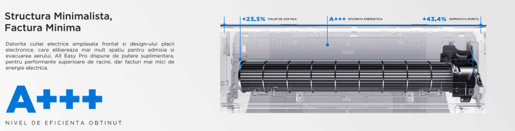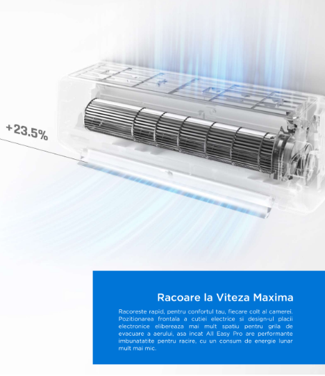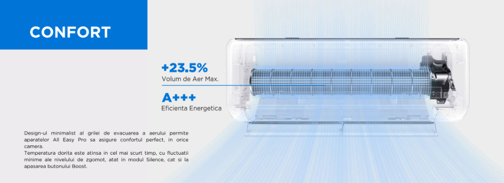 Designul minimalist al grilei de evacuare a aerului permite aparatelor All Easy Pro sa asigure un confort optim. Temperatura dorita este atinsa in cel mai scurt timp, cu fluctuatii minime ale nivelului de zgomot, atat in modul Silence, cat si la apasarea butonului Boost. In acelasi timp, volumul de aer emis este cu 23.5% mai mare fata de versiunile anterioare de unitati de aer conditionat.