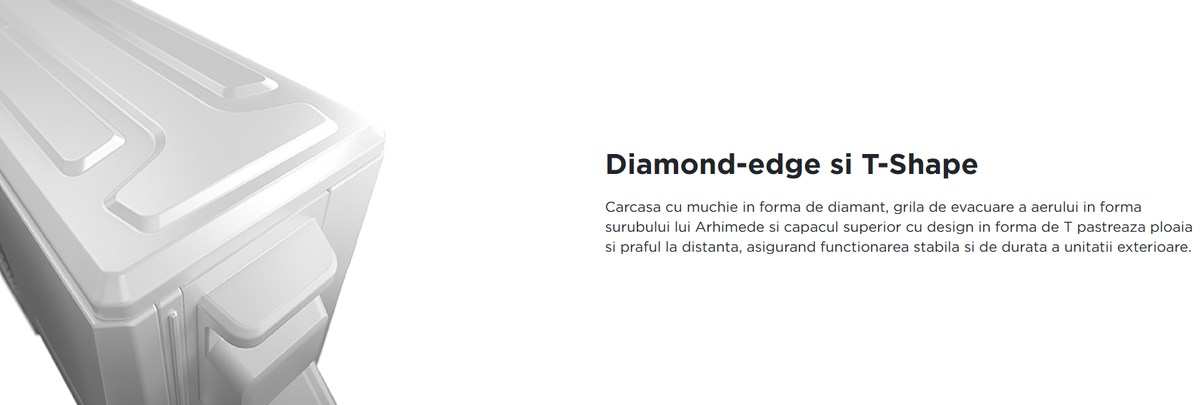 Carcasa cu muchie in forma de diamant, grila de evacuare a aerului in forma surubului lui Arhimede si capacul superior cu design in forma de T pastreaza ploaia si praful la distanta, asigurand functionarea stabila si de durata a unitatii exterioare.