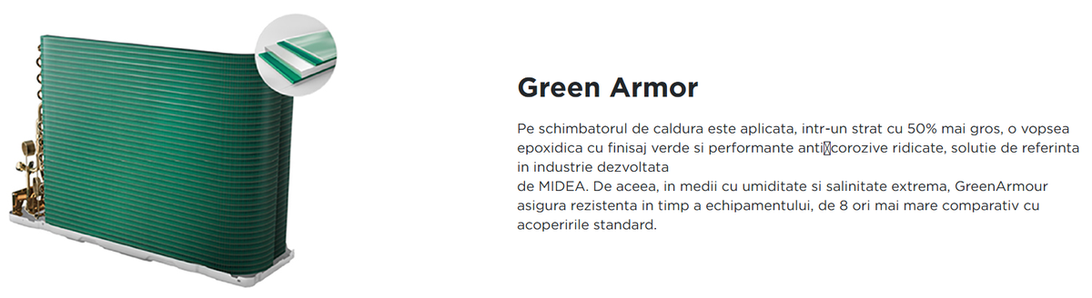 Pe schimbatorul de caldura este aplicata, intr-un strat cu 50% mai gros, o vopsea epoxidica cu finisaj verde si performante anti-corozive ridicate, solutie de referinta in industrie dezvoltata de MIDEA. De aceea, in medii cu umiditate si salinitate extrema, GreenArmour asigura rezistenta in timp a echipamentului, de 8 ori mai mare comparativ cu acoperirile standard.