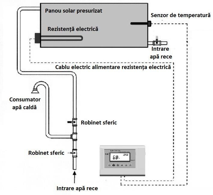 Sistemul solar poate fi echipat cu rezistență electrică care poate fi folosită pentru încălzirea apei din rezervor în situațiile în care încălzirea solară nu asigură suficientă apă caldă. Această funcție este comandată de temperatura apei din rezervor: controlerul verifică temperatura T1 din rezervor și în cazul în care aceasta este cu 3°C sub temperatura setată, încălzirea electrică este activată. În momentul în care temperatura apei din rezervor atinge valoarea setată, încălzirea electrică este dezactivată